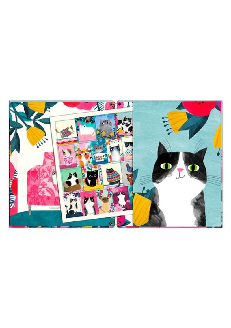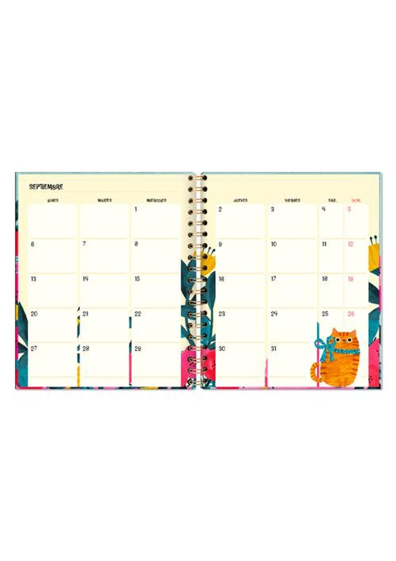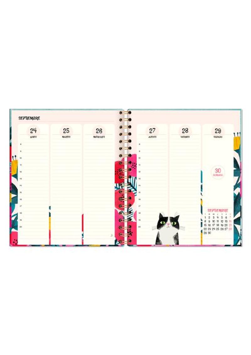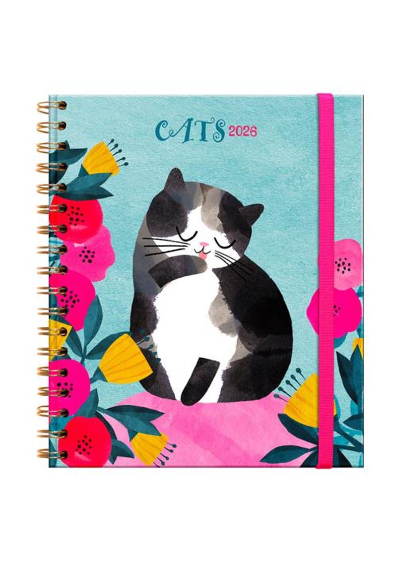 Agenda semanal de escritorio con temática de gatos. Contiene planificador mensual, cinta marcadora, balance y registro de gastos, stickers y bolsillo interior. Integra además “datos y control de mascota”, cierre elástico y papel de bambú de 100 g color crema para mayor resistencia.