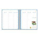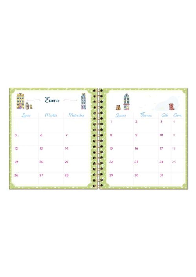Agenda semanal de escritorio para amantes de los perros. Incluye planificador mensual, cinta marcadora, registro de gastos, láminas de stickers y bolsillo interior. Añade una sección especial de “datos y control de mascota”, cierre elástico y papel de bambú de 100 g en tono crema.