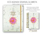 Agenda de pasta dura hecha con papel artesanal, con aplicaciones de hojas y flores naturales, tipo semanario. Incluye rutinas saludables, ideas productivas, separadores a colores por mes, planner mensual e ilustraciones propias en acuarela. Incluye libreta anillada de regalo de 80 hojas de 10 x 15 cm.