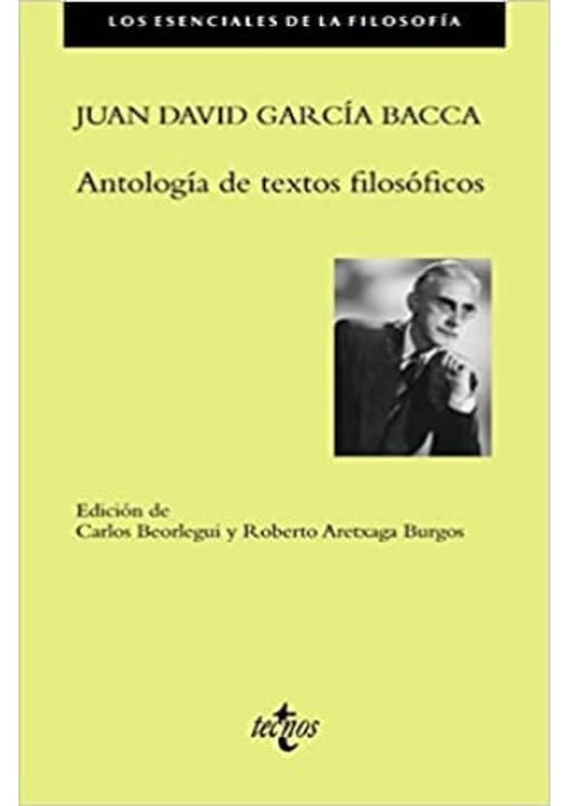 Esta Antología de textos filosóficos de Juan David García Bacca (Pamplona, 1901-Quito, 1992) pretende como primer propósito rendir desde nuestra colección Los Esenciales de la Filosofía un modesto, aunque no por ello menos merecido homenaje, a uno de los grandes pensadores españoles del siglo xx con una extensísima y variada obra de más de 200 títulos y miles de páginas en su haber a lo largo de 65 años de producción filosófica y literaria. (*CR*)En segunda instancia la intención de esta edición es ofrecer una selección panorámica de textos lo suficientemente variados de las distintas etapas que jalonan la trayectoria de Juan David García Bacca fundamentalmente para que el lector que por primera vez se acerca a su obra pueda apreciar la abundancia de registros temáticos y estilísticos que pueblan la extraordinaria carrera de un hombre sabio que en su itinerario por la vida tuvo que afrontar situaciones extraordinariamente difíciles mientras forjaba, con envidiable coherencia intelectual, esa extraordinaria y prolífica obra tan alejada de cualquier dogmatismo ideológico o espiritual como cercana a una inquebrantable voluntad de investigación científica, afán por el conocimiento y amor por la labor docente.(*CR*)Tanto los preparadores de la edición Roberto Arextaga y Carlos Beorlegui como Editorial Tecnos nos sentimos especialmente satisfechos de poder ofrecer a nuestros lectores esta antología seleccionada con la paradójica dificultad de elegir entre lo bueno y lo mejor, en lo que solo quiere ser, ni más ni menos, que un «esencial» reflejo de una obra enorme en calidad y cantidad, que ha marcado la historia de la filosofía en lengua española del siglo xx y es un referente indispensable para las nuevas generaciones de filósofos españoles e hispamericanos del siglo xxi.(*CR*)
