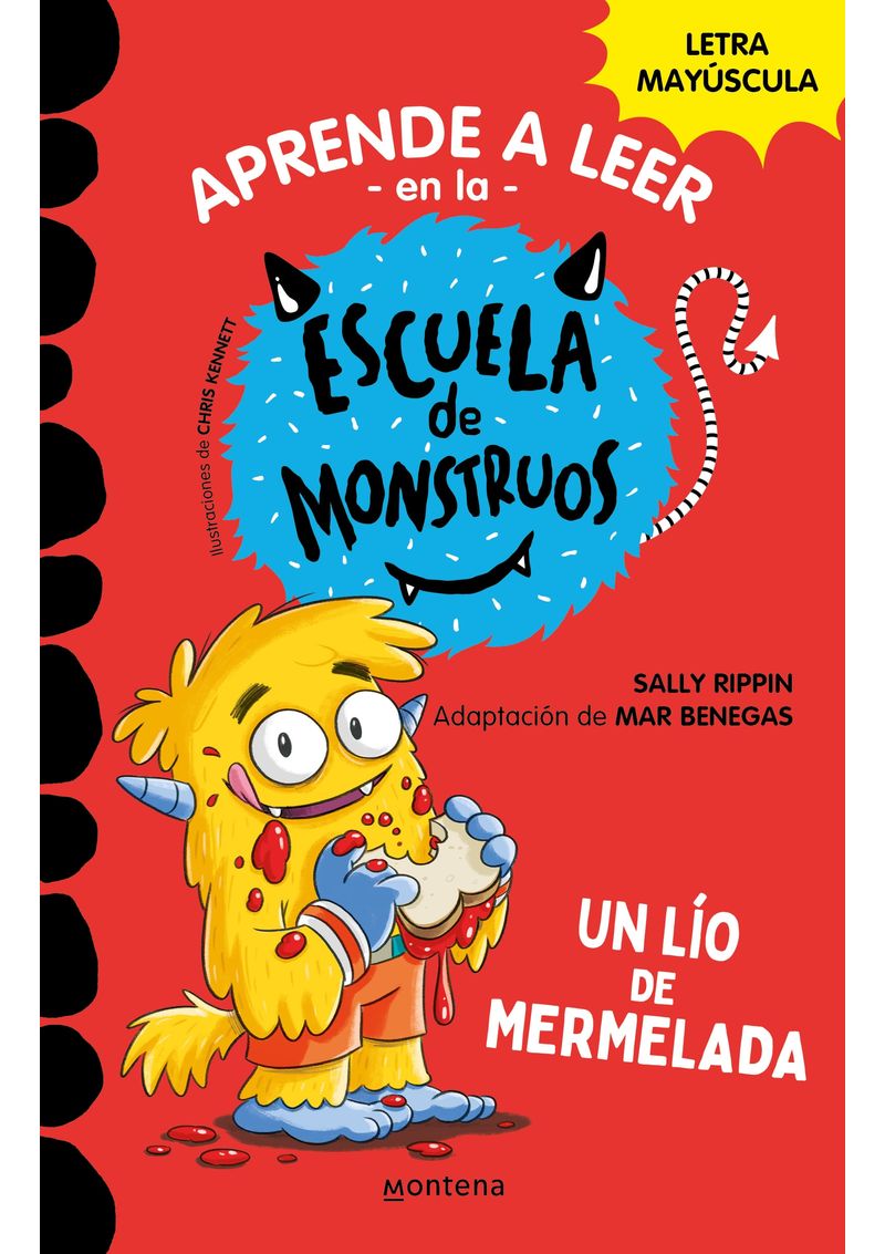 Escuela de monstruos con letra mayúscula y texto rimado, aprender a leer está regalado! Hoy Samuel come mermelada y deja la escuela toda manchada. Para limpiar todo al instante ¡pensará una idea brillante!