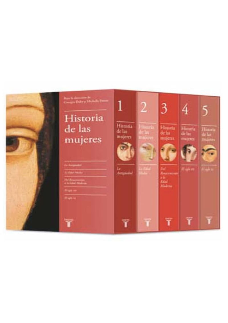 Los cinco tomos de una de las obras más destacables del historiador francés George Duby, Historia de las mujeres, en una magnífica edición estuche. La Antigüedad La Edad Media Del Renacimiento a la Edad Moderna El siglo XIX El siglo XX Esta Historia de las mujeres responde a la necesidad de ceder la palabra a las mujeres. Alejadas, desde la Antigüedad, del escenario donde se enfrentan a los dueños del destino, reconstruir su historia significa describir su lento acceso a los medios de expresión y su conversión en p ersona que asume un papel protagonista. Este análisis implica, asimismo, que las relaciones entre los sexos condicionan los acontecimientos, o la evolución de las sociedades. No se buscan conclusiones tajantes sino que las mujeres encuentren, al fin, su espacio propio. Esta obra busca analizar cómo las relaciones de los sexos condicionan la evolución de las sociedades y la necesidad de que las mujeres encuentren, al fin, su espacio propio.