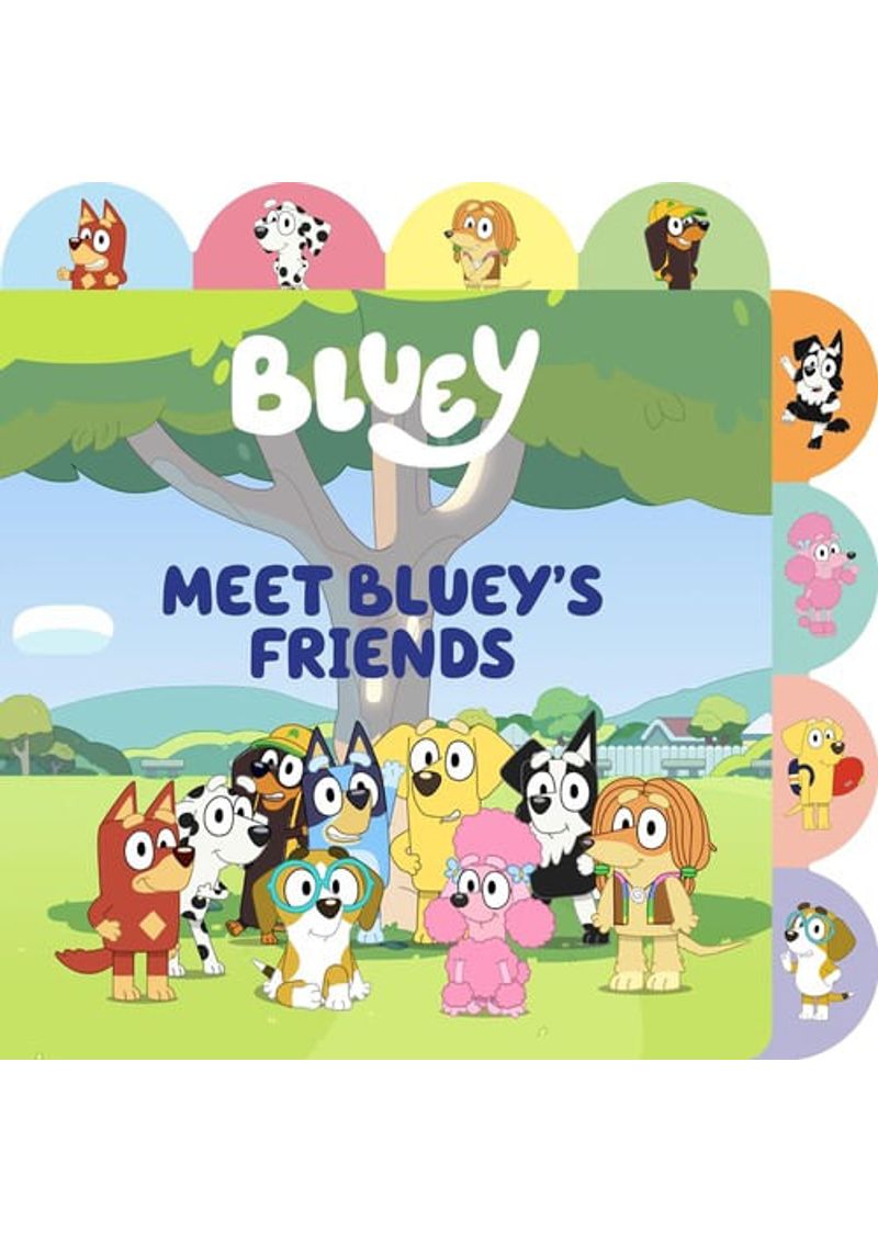 This is an adorable, sturdy tabbed board book designed for youngchildren, specifically targeting a reading age of 1 to 3 years old. Thebook is part of the Bluey series and serves as an interactiveintroduction to the various characters from the award-winning animatedshow, as seen on Disney+. The primary purpose of the book is for young fans to meet and identify Bluey's wide circle of friends. Each page is dedicated to a differentcharacter, featuring vibrant photos and scenes directly from the show. The names of the friends featured include Mackenzie, Snickers, Coco, andmore. The book's interactive design includes sturdy tabs on the side, allowingchildren to easily flip between pages to find their favorite characters. The simple text is designed to engage emergent readers and help themlearn new words. The durable board book format is suitable for young, curious hands. The overall experience aims to immerse children in thejoy and camaraderie of Bluey and her friends.